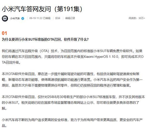 报纸记者贾亚莱·吴伊利(Jialai Wu Yuli)召回了SU7的110,000多个标准版本,并引起了人们的关注。根据市场监管州政府网站,小米汽车技术有限公司(因此,从称为“小米汽车”)根据“汽车生产产品管理”管理法规提出了一项国家管理计划,于9月19日(因此称为“小米汽车”)。得出的结论是记住SU7版本的DE - 电动车辆的一些标准版本,该车辆从2024年2月6日至2025年8月30日制造,从现在开始覆盖116,900。其中,召回号码S2025M0149I:涉及XMA7000MBEVR2和XMA7000MBEVR5型号,总计98,462辆车;召回编号S2025M0150I:涉及BJ7000MBEVR2型号,总计18,425 Ridersn。关于此召回,内幕人士对报纸记者做出了回应:这提醒了OTA软件,用户只需要升级系统即可。此召回不涵盖All已发送的SU7标准版本,仅包含少数标准版本的SU7版本的电动车辆的电动车辆,从2024年2月6日至2025年8月30日。如果驾驶员没有及时干预,碰撞的风险可能会增加并带来安全风险。小米汽车将通过车辆升级(OTA)技术在召回范围内的车辆中升级软件,以消除安全风险。 Sasathe Company已经能够与由短信,移动应用程序等拥有的汽车建立联系。召回是由公众广泛讨论的。小米汽车的官方微博还发布了“小米自动回答网民问题(第191集)”,以回应召回。根据小米汽车的说法,OTA版本的主要升级进一步改进了Driving-Helped版本的小米SU7标准版:优化高速飞行员,包括:调整高速飞行员辅助功能,高速公路和城市高速公路,以及对交通和绕道体验的更持续优化。当逐行行驶时,您可以尽早确定它,并提前完成线路的偏差,减少驾驶大型车辆时的压力感觉,并使M道路更灵活,更安全和大型车辆。另外,将添加“动态速度”功能。升级后默认启用此功能。它支持组织有助于驾驶速度,以帮助驾驶速度控制方法对复杂环境(如雨天和辅助驾驶功能升起)等夜晚。当有助于帮助驾驶速度的速度时,可以根据道路和交通环境来正确维修照明策略。当激活辅助驾驶功能时,默认情况下将远光灯定义。后来,雷Jun通过了回答:“那些拥有汽车的人,仔细观察。”小米su7是第一个进入水田领域的小米。它于2024年3月正式启动,并于4月开始交付,起价为215,900元。 SU7提供了三个版本的调整:标准版,Pro和Max版本。该版本是一个相对低调的模型。官方信息显示,配备标准版本的辅助驾驶系统是“小米PILOT PRO”,而配备了其他两个版本的高配置的系统为“小米Pilot Max”。更明显的区别在于,标准版本不配备LIDAR,而是只有1毫米雷达。今年7月,小米Auto正式宣布,小米SU7总共提供了30万辆。自小米SU7于2024年4月开始交付以来,它在2024年11月18日实现了100,000辆的目标交付,持续了7个以上月份; 2025年3月18日,SU7实现了200,000个单位的目标交付,仅持续了4个月。根据财务报告,小米集团的现代业务的收入从去年第二季度的64亿元人民币增长了233.9%,增加到了213亿元人民币;其中,主要车辆的主要车辆收入从2024年第二季度的62亿元人民币增长了230.3%,到今年第二季度的206亿元人民币,这主要是由于车辆和ASP交付的数量增加。该新闻扩展是根据第一次金融新闻的报道,去年3月,SU7小米的第一批产品被正式推出,标准版本的价格为215,900元,Pro远程版本的价格为245,900元,最大版本的价格为299,900 Yuan。去年4月3日,第一批汽车运送开始,汇票的总量超过300,000辆。小米自动召回了116,900 su7,相当于体积的30%e交货。就在两天前,公众的工业和信息技术部要求对强制性的国家标准(因此称为“新的国家标准”)的意见,即“对合并驾驶援助系统结合的明智连接车辆的安全要求”。该标准设置了针对人类计算机联系,绩效安全性和预期性能安全性,信息安全性,数据记录等的全面技术安全要求,例如单线,多车道和飞行员帮助。其中,针对道路交叉口,建筑区,岛屿,隧道等交通环境的常见建筑测试情况,还为诸如打字踏板摩托车,临时障碍和倾覆的目标的发现能力和响应增加了测试。第一位财务记者指出,新的国家标准通过了测试合并驾驶员援助系统E的新要求。特别是第7.5.8章中的“ B类环境建设区域检测和响应能力测试”。该测试的场景复制了“ 3.29 Tongling小米SU7爆炸事故”的场景几乎1:1。此试验场景要求测试工具在系统激活状态下以VSMXSOT的速度牢固地向右车道,在系统激活状态下进行巡航速度,并在测试中至少在施工中均可在施工中进行200m范围的驾驶员,包括该型号的连接,包括MET,包括Met:包括Met:包括:MET的驾驶员,包括。测试车辆与车辆的目标和交通锥相撞;如果测试车是M级汽车,那么与交通锥TTC的距离为1.0时,仍然没有衰减或转向动作;如果车辆测试是M级汽车以外的类型,那么与TTC流量的距离为3.0时,仍然没有衰减或转向动作。到今年3月底,小米SU7标准在汤林(Anhuiang Highway)处于汤林(Tongling),发生了严重的交通事故,造成三人丧生。小米在4月1日回答:“在事故发生之前,车辆处于NOA智能辅助驾驶状态,并继续以116公里/小时的速度驾驶,由于施工和排列,驾驶的速度为116 km/h。,在内部封闭的道路上,在内部封闭的道路上,并转移到LAN转向。 3秒钟。安全是头等大事,因为一旦发生安全事故,就会付出生命的价格。电子获取率并提高对极端情况的反应能力。许多汽车公司强调创建“冗余”安全性。该问题的高级编辑Zhou Yuhua