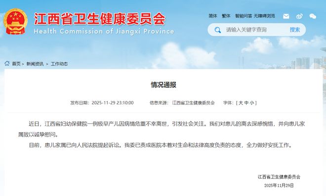 新京报11月29日晚间,江西省卫健委发布情况通报,内容如下:近日,江西省妇幼保健院一名极早产儿因病情危重不幸死亡,引起社会关注。我们对孩子的去世深感遗憾,并向孩子的家人致以诚挚的感谢。目前,孩子家属已向人民法院提起诉讼。我们委员会指示医院本着对生命和法律高度负责的态度,尽力提供安慰。图为江西省卫健委发布的通报截图。此前有报道称,江西一名早产儿从保温箱中出来后昏迷不醒。孩子的母亲表示,在孩子出生时没有人知道。 “短短一个小时,到底发生了什么事情,导致孩子出现紧急情况,需要紧急抢救,最后陷入深度昏迷死亡?”雷塞特别是,江西省南昌市黄木拉女士,是江西省妇幼保健院的医院,是江西省妇幼保健院的医院。经过一个半月的治疗,孩子的病情逐渐好转。就在医生发出“母婴一起做好准备”的通知后一个多小时,孩子突然发病,昏迷十多天后死亡。 11月27日,黄女士在封面新闻中表示,截至目前,江西卫生部门尚未给出任何评论。院方回应称“国家卫健委已介入调查”。离开保温箱前,早产儿突然病危。今年8月6日,黄女士宣布黄女士要报道儿子天乐出生的消息。由于母亲体内“羊水少”,孩子在预产期31周时通过剖腹产早产。出生时体重仅960克。生活在保温箱里的天乐“这是我和妻子的第一个孩子,我们非常爱他,不惜一切代价希望他安全健康。”黄女士说,为此,黄女士选择了江西省最具实力的新生儿医院江西省妇幼保健院分娩。孩子还住在医院的保温箱里接受产后治疗。 “保温箱里孩子的情况逐渐稳定,短短一个半月的时间,孩子体重从960克增加到1.87公斤,除轻度胆汁淤积外,其他监测指标和检测结果均正常。23日,孩子的正确孕周为37+6周,每两小时喂奶26毫升,能吃奶10毫升左右。” 9月23日中午12时52分,黄女士接到医院新生儿科的电话。电话中,孩子的床边医生陈女士告知。黄女士表示“第二天眼底筛查完成后,就可以在母婴室的房间里准备了”,并要求夫妻俩准备好必要的衣服、早产奶嘴等物品。 “他还告诉我们,今天给天乐洗澡,这是他出生以来的第一次。听到这个消息,我真的很高兴。这意味着我儿子的病情稳定了,不再需要戴呼吸机、输液、打针等,非常健康。”黄女士说。然而,正当夫妻俩满怀希望地准备新生儿物品时,孩子在医院的情况却发生了巨大的变化。 23日14时58分,黄女士致电医院询问选择“早产儿奶嘴”的情况。 “电话是一位女医护人员接听的,我说要找孩子的主治医生陈某,并说我是18床天乐宝宝的母亲。”黄女士回忆,女医护人员告诉她,陈女士患有下班了,要和另一位医生转接,然后说“出事了”,就轻松地挂了电话。感觉不太对劲。对方犹豫了一下,听说我是18号床孩子的妈妈,就又打了电话,这次对方说“18号床出事了”。 “女士有不好的预感,立即赶去救援。黄女士提供的病历显示,9月23日13时09分,天乐各项指标稳定正常;14时20分,天乐病情发生变化,出现“面部发绀、四肢松散、反应差”。 “陷入深度昏迷的天乐接受了紧急抢救,但天乐陷入深度昏迷,失去了自主呼吸和意识,依靠营养液部分维持生命体征,出现异常。”黄先生认为,既然排除了孩子自身的因素,那么危重的病情很可能是受到外界因素的影响。热内特遗传病的ic测试结果。不过,对于孩子为何突然病重,医院尚未给出明确解释。与此同时,江西省妇幼保健院拒绝向女士的家人提供。然而,经过调查,医院女士声称没有后续,但他们错误地改变了措辞,很明显他们在骗我们,现在我们不能相信他们的任何说法。 ”黄女士表示没有办法。同时,黄女士表示了强烈的疑惑和不解。“即使他们没有主动打电话,但我们打电话时,只要被告知‘孩子已经救了,家人来了’,我们都能理解。毕竟抢救病人是刻不容缓的。“不过,医院并没有提及此事,如果不是我不小心打电话,我什么时候知道儿子出事了?”至于,该女子及家人给出了书面回应。上面写道:“执勤的医护人员优先保证孩子的生存。他们首先与患者家属沟通称“孩子的病情发生了变化”。医生很容易处理,稍后会给你打电话。”他们目前没有完全解释救援的具体细节。孩子后来不幸死亡,医院回应称“正在调查中”。 “10月5日,天乐昏迷的第13天,我们做出了放弃治疗的艰难决定,男孩终于离开了我们。”黄女士在《封面新闻》上表示,他们的家人想了解事情发生的具体细节。天乐去世后,黄女士及家人多次向江西省卫健委反映情况,但未得到答复。 “我们把材料递交到他们的接待窗口后,工作人员没有再回复,我们也无从得知目前的情况。” 11月27日上午,封面新闻记者致电江西产妇妇幼保健院的客服人员表示:“我们需要向领导汇报,了解情况后再做出回应。”下午 4 点左右下午,记者再次致电。工作人员表示,他们向领导请示,也可以代表医院回应。 “省卫健委正在调查此事,结果出来后院方将发布统一公告。”特别声明:上述内容(如有则包括照片或视频)由自媒体平台“网易号”用户上传发布。本平台仅提供信息存储服务。