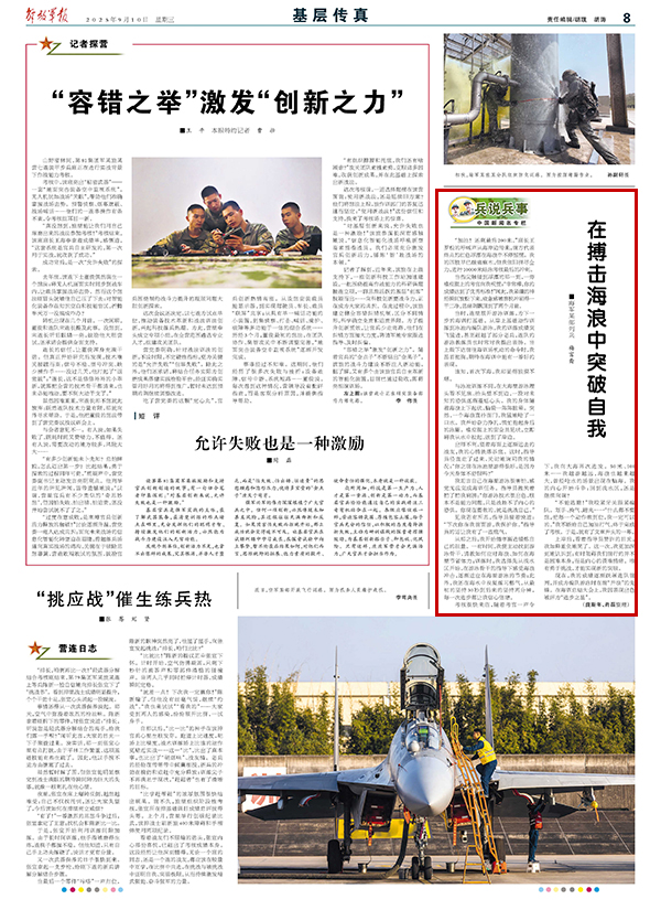 打破自己的浪潮■海军梅富伊的私人“来吧!仍然还有最后200米。”小队领导人王卢森(Wang Luosong)的喊叫来自海岸,红色的浮子代表着海浪前的端线。我的四肢很痛苦又麻木,但我仍然尽力执行10,000米蛙泳分析的最终冲刺。一旦我的手指碰到了漂浮物,橡胶船检查就向我致意:“太好了,您的分数达到了很棒的标准!”听到它,我紧张的神经立即放松,我的疲劳在喜悦中沐浴,我的想法回溯到两个月前。当时,该公司进行了游泳培训,为海上训练的下一步奠定了基础。从基本训练到沿海运动,再到游泳池游泳,我的训练成绩得到了飞跃和边界的改善,甚至超过了一些退伍军人。公司游泳教练经常赞美我。当我的上级发布为了去赛车训练场所,我握住了头,希望在海上训练区表现出色。出乎意料的是,当我第一次出海时,我感到尴尬。与游泳池训练不同,在海中游泳是看不见的,看不见底部或看上去,这是对未知的逐渐散布在我心中的恐惧。我的身体正在升起,落入海浪,头晕目眩。突然,一波撞到了门,我笑了起来。纳吉(Nagi)开始挣扎,急忙让戒指在我身后游泳。看到这一点,安全人员立即将我从水中拉出来,将我送到海岸。外出不好。看着我的同伴慢慢地进入大海,我的心情落在了底部。这时,导师走了起来,提醒我:“您以前很擅长游泳池。您现在不舒服吗?”我承认我害怕在海上游泳,觉得我无法完成海上训练工作。这位导师笑了笑,拍了拍我的肩膀:“您拥有出色的游泳技巧。这不是能力问题,但您无法克服内心的恐惧。您现在要做的就是挑战自己。”看到我在想,导师继续说道:“下次您在我面前游泳时,我会保护您”教练的话使我充满信心。从那以后,我开始训练勇敢的步骤 - 步骤。一旦我有时间,我主动寻找游泳骨干,并询问如何处理海浪以及如何慢慢适应海洋节奏。越来越大,在我的脑海中出现了窒息水的场景。我的心开始战斗:回到浅水,还是继续前进? “你无法逃脱!”我刷牙然后跟着。划船,呼吸,踩踏...“别考虑任何事情,做每一个动作,我一定会做的。”我继续鼓励自己,最后完成评估。因此,在开始的场景文章即将到来。到达海岸后,我看着教练的鼓掌。松了一口气。目前,我意识到有时候,不是自己的困难阻止了我们前进,而是对我们心中痛苦的恐惧。只有勇敢地挑战新的成功。现在,我的分数逐渐领先于公司,并在游泳时在编队中的“波浪”中naving先驱。在海上培训摘要会议上,我因出色的表现而被评为“进步之星”。