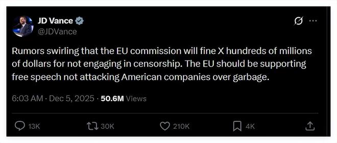 美国与欧洲官员之间的“口水战”是由上周欧盟对美国社交平台的制裁引发的,美国与欧洲官员之间“口水战”的第一个火花被美国副总统万斯注意到。上周有消息传出,欧盟决定对x平台违反社交网络监管规则处以1.4亿美元罚款后,万斯于12月5日发文,指责欧盟试图迫使X限制言论自由,并称惩罚平台x的规则是“垃圾”。截至周一,万斯的在线帖子浏览量已超过 5000 万次。继万斯的帖子截图之后,负责监管美国互联网接入、电视和广播等通信网络的美国联邦通信委员会(FCC)主席布伦丹·卡尔也在12月5日发帖,形容欧盟对X的惩罚是“腐烂的欧盟”对美国科技公司的嫉妒和仇恨。伦丹·卡尔(Lendan Carr)发表了一篇批评欧盟的帖子。 12月6日,美国国务卿和多名接近白宫的国会议员延续了5日美国对欧盟的攻击力度。其中,卢比奥声称欧盟制裁是对美国和美国人民所有科技平台的“攻击”,而美国国会共和党参议员克鲁兹则称欧盟制裁是对美国“就业”和“每个美国人的言论自由”的“攻击”,2月-8日晚分别获得了2360万和2000万的浏览量。卢比奥称欧盟制裁是“攻击” “在美国和美国人民的所有科技平台上。”美国议员愤怒批评欧盟,他的帖子8日晚获得3770万浏览量和25万点赞。马斯克嘲讽完欧盟。当然,欧盟也很苦恼。闪闪发光。然而,这些反击很大程度上导致了更多美军军官的命运。例如,上周日,正在欧洲出差的美国公共外交国务卿罗杰斯刚刚在官邸录制了一段近2分钟的视频,视频中他列举了一系列他所说的欧盟(和英国)“压制言论自由”的案例。尽管他列出的案例的真实性受到欧洲方面的质疑,例如8日,他的帖子获得了超过600万的浏览量。罗杰斯为此录制了一段近2分钟的视频批评欧盟。美国《时代》杂志不仅在头条中调侃美国政府正在与欧洲“交战”,还在文章中援引欧洲官员的话称,美国对欧洲的攻击将进一步强化特朗普政府“是欧洲的敌人”的认知。美国《时代》杂志报道截图。延伸阅读:欧盟敢惩罚肌肉吗?第一、第二领导者美国外交上的人物先后批评欧盟1.2亿欧元(约合1.4亿美元)的罚款,引起了美国政府的强烈不满。据路透社12月6日报道,继美国副总统兼国务卿卢比奥之后,欧盟第二任外交司令、副国务卿克里斯托弗·兰多也加入了批评欧盟的行列,并将此事上升到了更广泛的意识形态和战略层面。作为X平台的所有者,马斯克呼吁退出欧盟。卢比奥5日在X平台发文称,欧盟委员会1.4亿美元的罚款不仅针对X平台,也是外国政府对美国科技公司和美国公民的攻击。 “对美国互联网用户进行在线审查的时代已经结束,”卢比奥写道。 “更糟糕的是,美国已经与通过欧盟攻击我们的国家结成了军事联盟。”兰多转发了卢比奥的帖子并发表评论。他表示,欧洲国家“不能一边依靠美国来确保自身安全,一边又通过(非强制、非民主、非表达性的)欧盟积极损害美国的安全。”美国副国务卿克里斯托弗·兰多在另一则帖子中进一步表示,欧盟与欧盟存在分歧即使在北约框架内,这种情况也削弱了美国和欧洲之间的合作,他还表示,“当各国戴上北约的帽子时,他们坚持认为跨大西洋合作是我们共同安全的基础,”兰多写道,“当他们戴上欧盟的帽子时,他们推行的议程往往完全损害了西方国家的利益和安全。”美国……这种矛盾的情况不能再继续下去了。”经过两年的调查,欧盟委员会于当地时间12月5日认为X平台未能满足《数字服务法案》的要求,并对其处以1.2亿欧元的罚款。路透社称,这是欧盟《数字服务法案》生效以来的首个重大执法行动。欧洲监管机构称,对平台X的罚款包括误导性的蓝标认证、广告记录缺乏透明度以及拒绝向研究人员开放公共数据等。宣布这一决定后,美国副总统万斯在社交平台x上表示:“有传言称欧盟委员会对企业有利。”路透社指出,美国高级官员可以影响美国企业的处罚决定。该法案对美国苹果和Meta等科技巨头分别处以5亿欧元和2亿欧元的罚款。早些时候,EU对谷歌发起多项反垄断调查,并处以总计82.5亿欧元的罚款。近几个月来,特朗普总统多次指责欧盟的制裁“不公平”,并称其为针对美国企业的“歧视行为”。特朗普还威胁要对欧盟征收报复性关税。欧洲版《政治新闻》评论称,制裁平台X的决定加剧了欧盟与特朗普政府之间本已紧张的关系。路透社指出,在更广泛的地缘政治挑战背景下,特朗普政府一方面试图维持北约内部团结,另一方面又发出与美国关系可能发生重大转折的信号,双方紧张关系逐渐显现。有效分担防御负担,偶尔赞扬相关盟友。兰多今年6月曾发帖质疑北约存在的必要性,但随后他删除了该帖子。在欧盟宣布实施制裁的决定后,马斯克曾呼吁解散欧盟,但由于他与特朗普政府多位官员发生矛盾,甚至远距离骂特朗普本人,马斯克于5月底离开了特朗普政府。与特朗普闹翻几个月后,马斯克于今年 11 月回到白宫参加特朗普的晚宴并进行社交活动。外界认为,这可能是马斯克与特朗普关系修复的信号。当地时间11月18日晚,马斯克在白宫出席美国总统特朗普为沙特王储萨勒曼举办的晚宴。视频截图